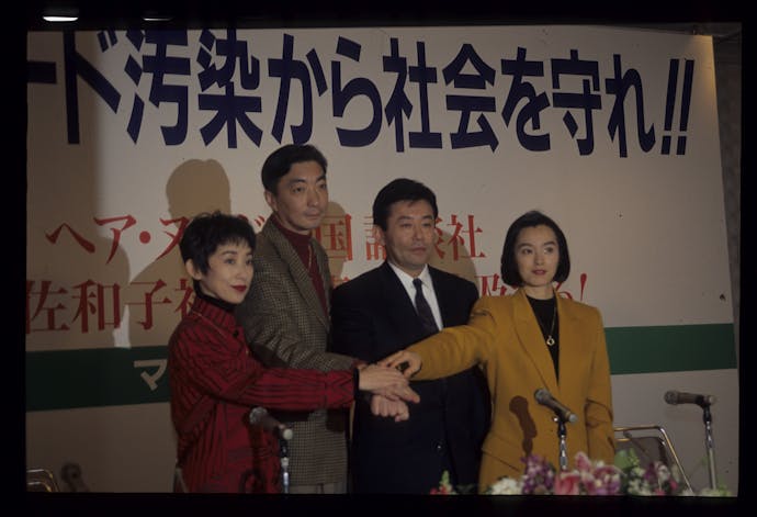 ‘Media Ethics’ representatives of Kofuku-no-Kagaku: actress Tomoko Ogawa, writer Tamio Kageyama, publicist Kujo Ogawa and journalist Junko Tanaka, November 1994.