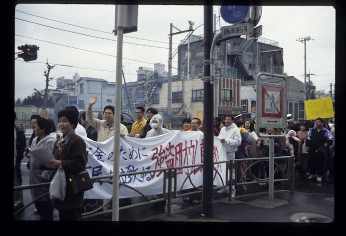 Kofuku-no-Kagaku members on their way to protest outside Aum Shinrikyo’s Tokyo headquarters, two days before the sarin attack.