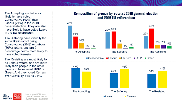 There are also differences in political support, with the Accepting significantly more likely to be Conservative supporters, the Resisting more likely to support Labour, while the Suffering are most likely of the three groups to be Remain supporters. Each of these patterns will partly reflect the different age and gender profiles of party and Brexit support.