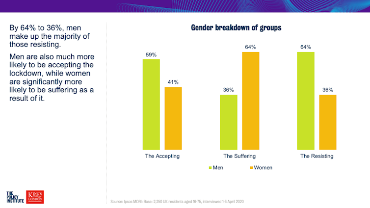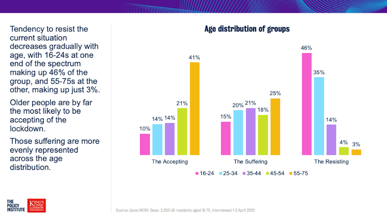 The Suffering, in contrast, are spread across the age range, but are significantly more likely to be women, while men make up the majority of the other two groups. This pattern is reflected across the survey more generally, with women much more likely to report higher stress levels, difficulty sleeping and concern about the impact of continuing lockdown measures.
