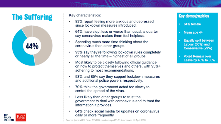 You can get an idea of the incredible variety of experiences of the lockdown among these different groups through their responses to just a few questions. For example, nearly all of the Suffering group say they have been more anxious or depressed since the measures were announced, compared with just 8% of the Accepting. A third of the Suffering say they think about coronavirus all the time, compared with 11% of the Accepting.
